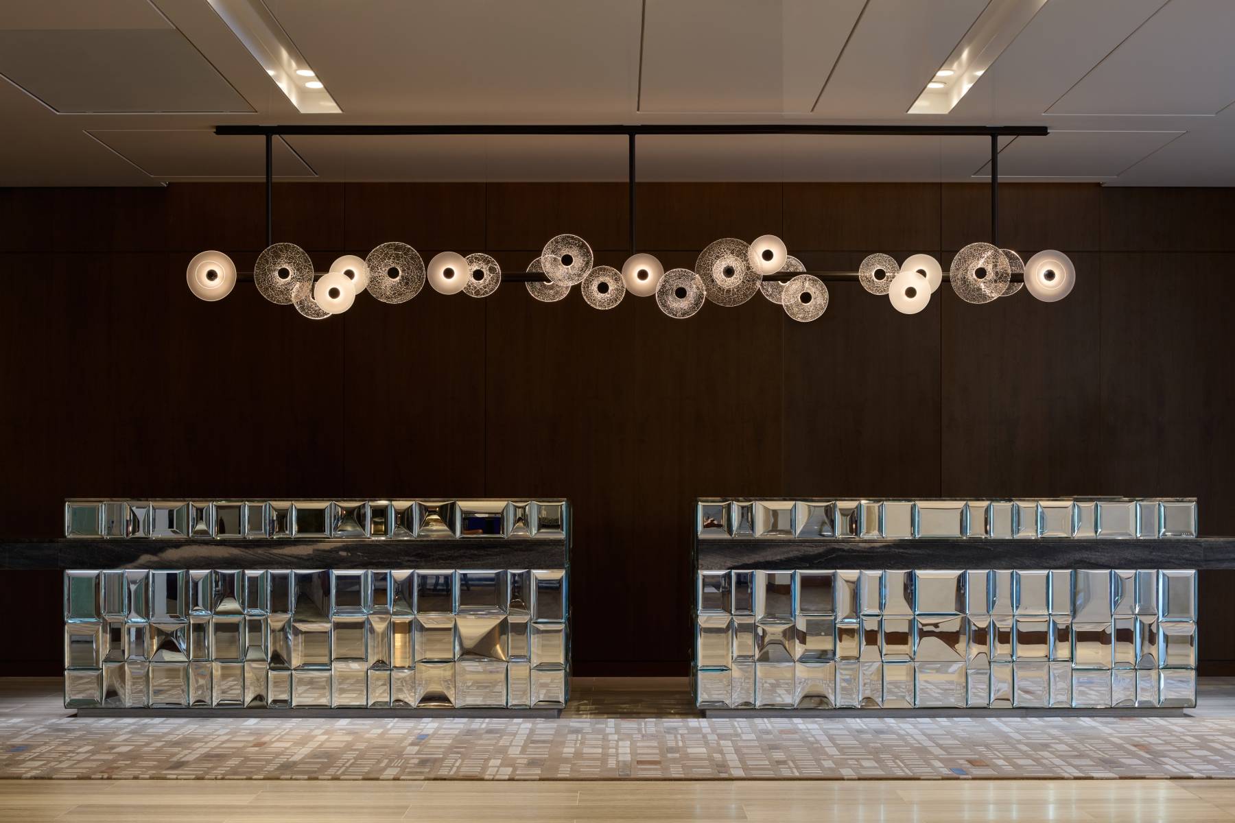 Recepce v přízemí je složena z atypicky vyráběných skleněných tvarovek od Jana Černohorského.