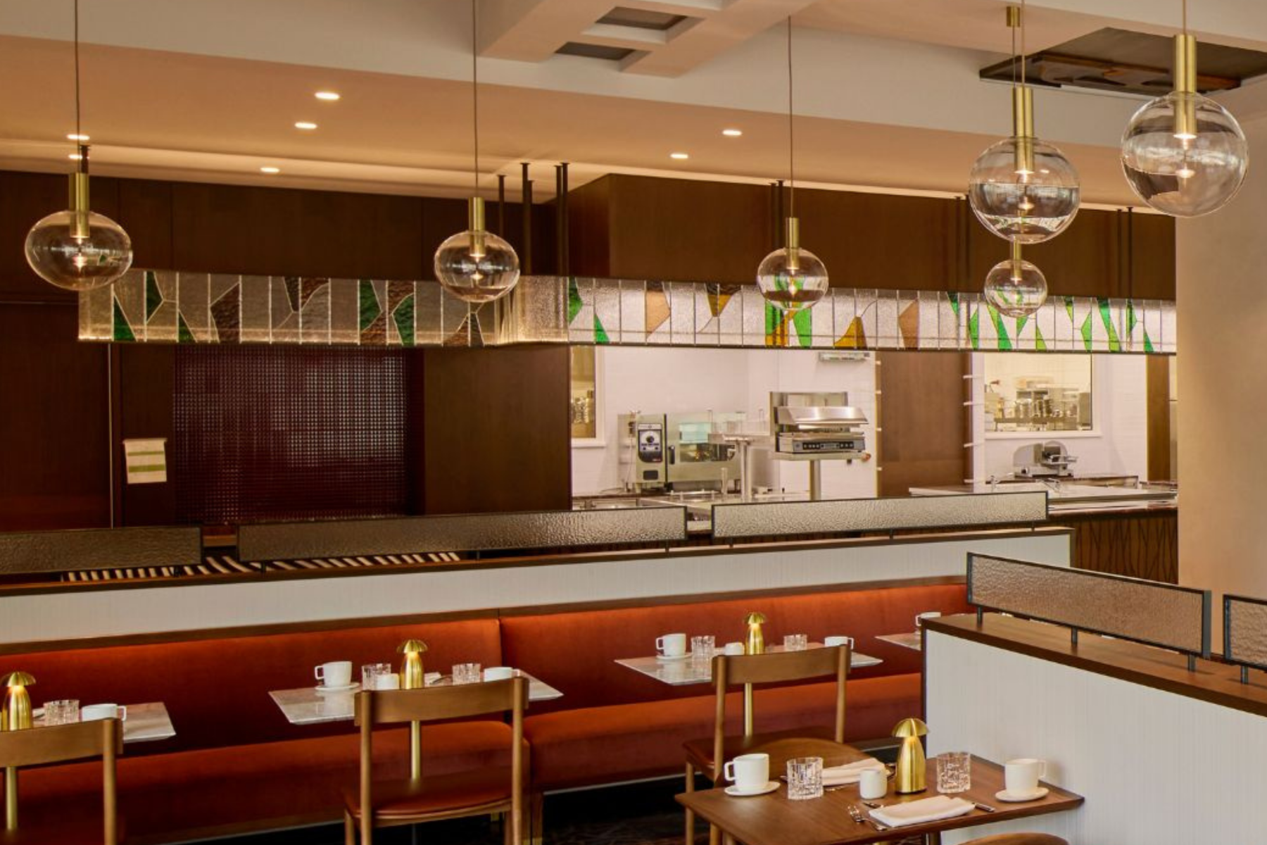 Prosklené závěsy nad pulty v restauraci Kafka Brasserie: Novodobé vitráže v prostoru doplňují původní Jírovy kompozice.